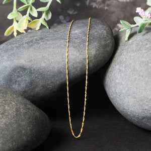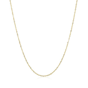 This Singapore chain comes in 14k yellow gold and has a width of 0.8 millimeters.