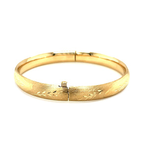 A classic floral carved high polish bangle crafted in 14k yellow gold with a hidden clasp.