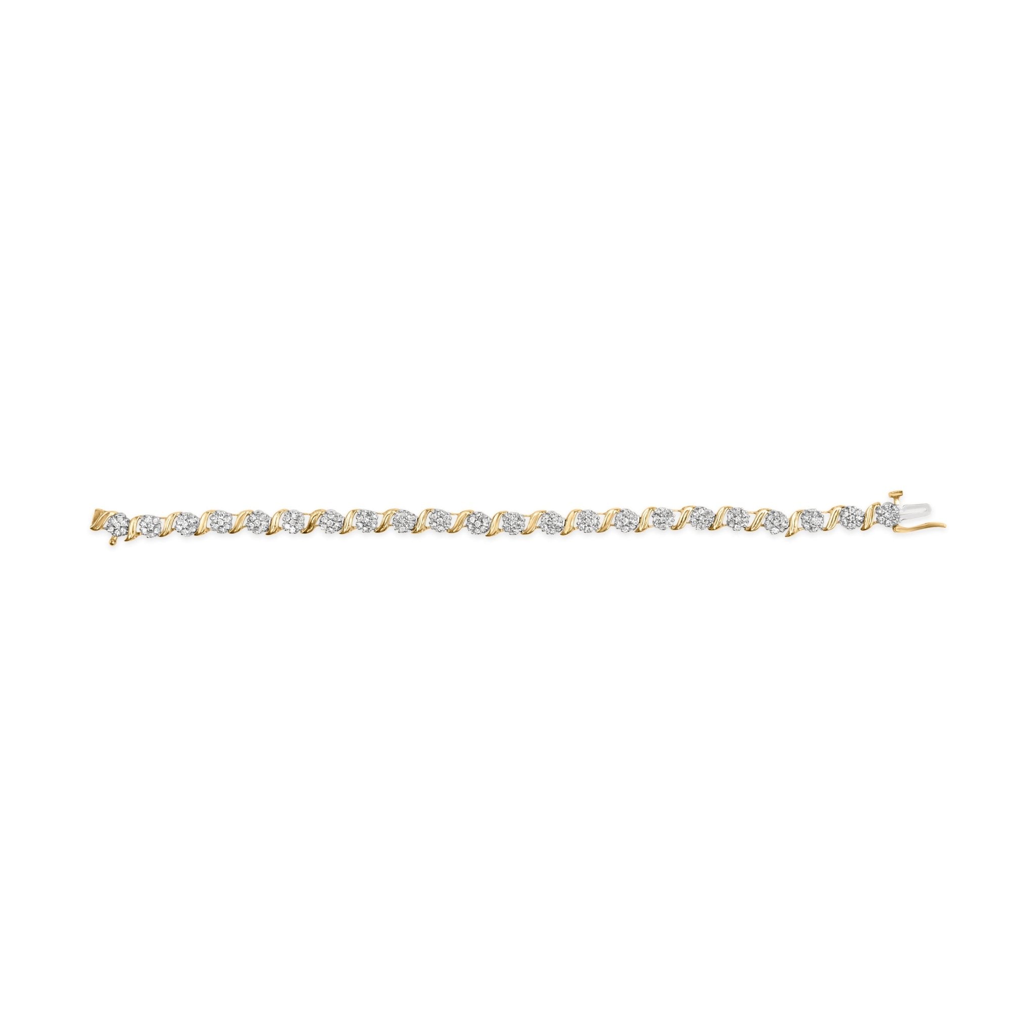 Introducing a dazzling masterpiece that will leave you breathless - a 10K Yellow Gold Diamond Floral S-Link Bracelet. Crafted with love and precision, this exquisite piece features a mesmerizing cluster of 154 natural round-cut diamonds, totaling a remarkable 2.0 carats. The diamonds, with their J-K color and I1-I2 clarity, are delicately set in a prong setting, ensuring maximum brilliance and sparkle. This bracelet is designed to adorn the wrist of a confident and elegant woman, adding a touch of sophistication to any ensemble. With its secure box clasp, this bracelet will stay securely in place, allowing you to shine and captivate wherever you go. Indulge in the luxury of this stunning diamond bracelet and embrace the allure of timeless beauty.