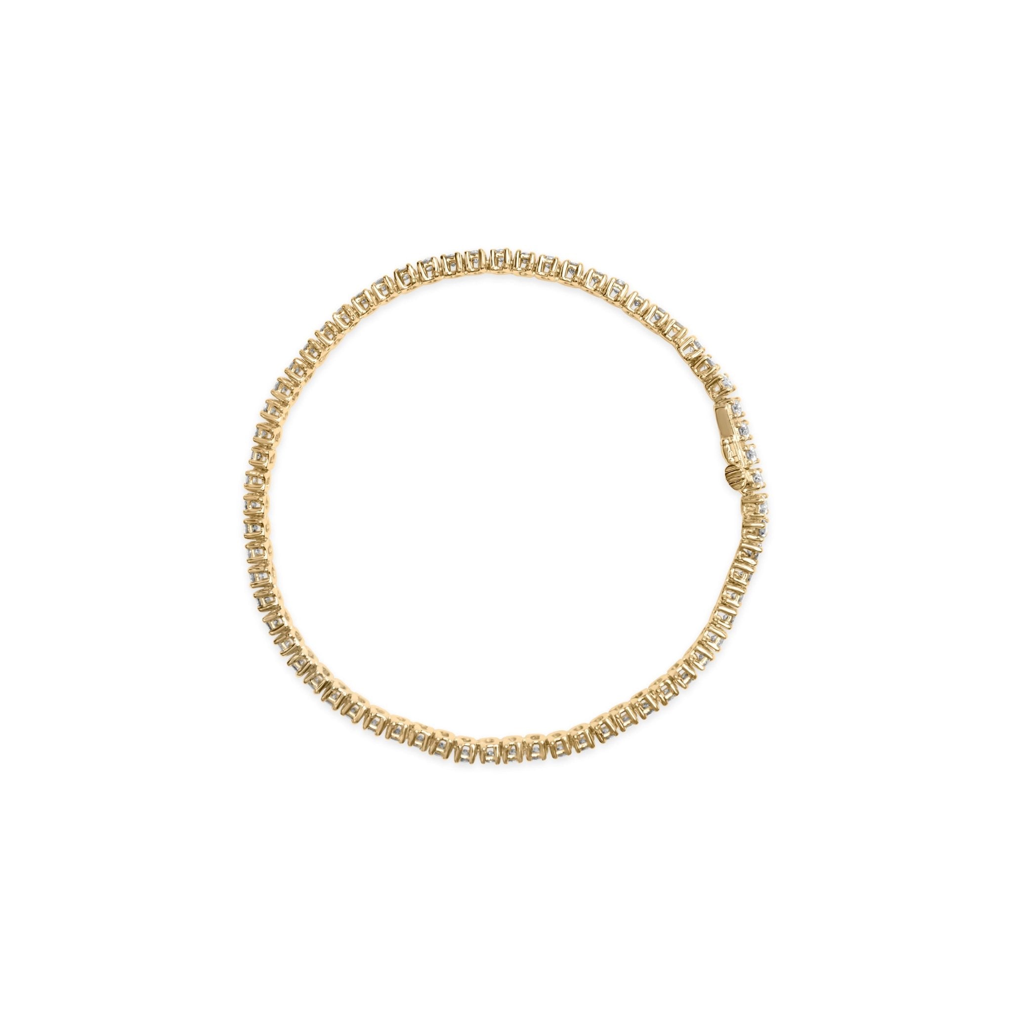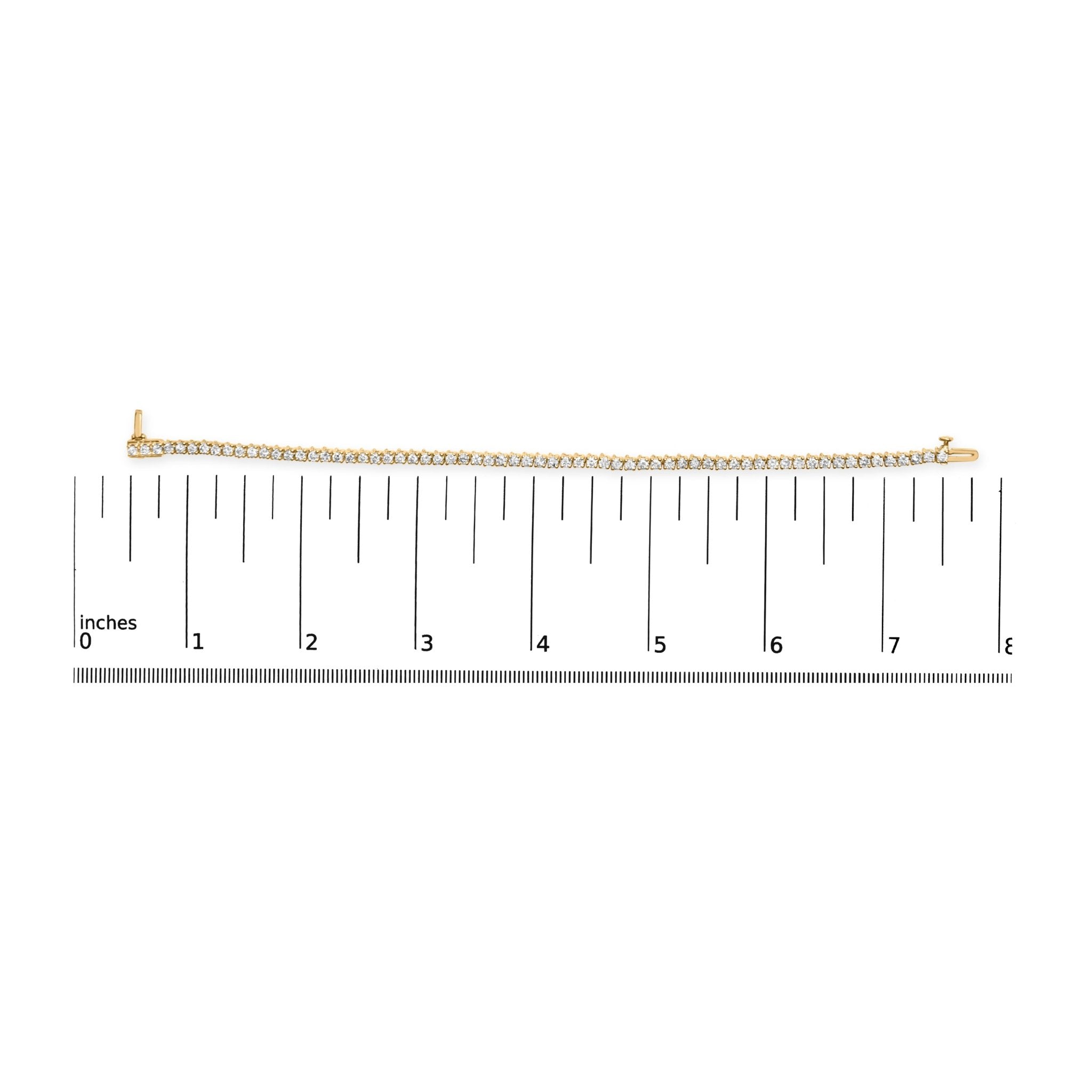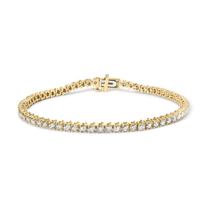 Introducing our stunning 14K yellow gold 3.00 Cttw round brilliant-cut diamond tennis bracelet! This piece features a beautiful array of 65 natural diamonds, totaling 3.0 Carats, all perfectly prong-set to create a stunning and continuous sparkle on your wrist. The J-K color of these diamonds adds a warm and romantic touch, while the I1-I2 clarity gives them a distinct character. The classic 4-prong setting secures each diamond in place, creating a stunningly classic look. This tennis bracelet is designed to fit wrists up to 7.25" and features a box clasp to keep it secure. Perfect for any occasion, this piece will add elegance and sophistication to any outfit.