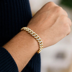 This Modern Lite Miami Cuban bracelet with white pave is beautifully crafted in 14k yellow gold with a high polish finish and closes with a box clasp. Measuring 8.0 mm width and available in 8 1/4 inches length.