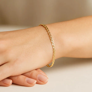 This mariner link bracelet comes in 14k yellow gold and has a width of 3.2 millimeters. Secured with a lobster clasp.