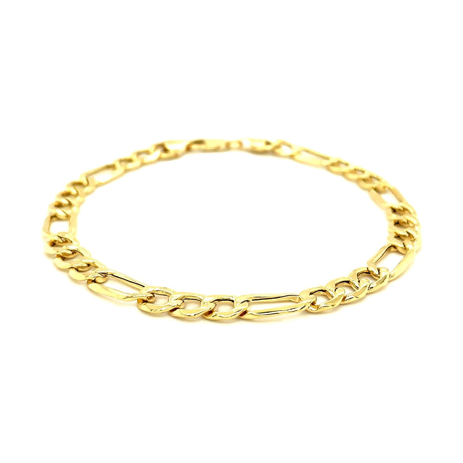 This lite Figaro bracelet comes in 14k yellow gold and has a width of 6.5 millimeters. Secured with a lobster clasp.
