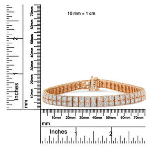 Beautifully classic, this stunning tennis bracelet has an impressive total diamond weight of 3.0 c.t. This piece is crafted in 14k rose gold, a metal that will stay tarnish free for years to come. It has a double row design embellished with round-cut diamonds. The stones are lab-grown and have a G-H color and a VS2-SI1 clarity. This piece closes with a box clasp mechanism for a safe and secure fit on your wrist. You will love how this rose gold and diamond bracelet adds a touch of glamour to your overall look!