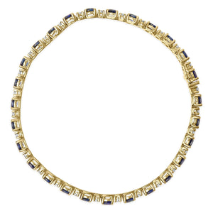 Discover your wrist encircled by the symphony of light and color with this 18K yellow gold bracelet, where 3/4 carat of crisp, natural diamonds and 5 1/3 carat of oval-shaped, color-treated blue sapphires in a breath-taking dance. Each sapphire, radiant in its vivid blue hue, is meticulously prong-set in an elegant east-to-west orientation, highlighting the extraordinary craftsmanship. The diamonds, set with equal precision, radiate unmatched clarity and color (G-H, VS1-VS2), creating a cascade of sparkle that mirrors the stars. Designed to grace a wrist of up to 7.25 inches, this piece promises not just a fit but an experience, enhancing every gesture with a wave of luxurious charm.
