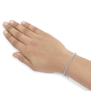 Elegant and timeless, this gorgeous 14 karat white gold tennis bracelet features 4.0 carat total weight of lab grown round brilliant cut white diamonds with a whopping 67 individual stones in all. The tennis bracelet has hinged links consisting of a single prong set diamonds each. The 7” long bracelet culminates in a secure box with tongue and safety clasp. Whether worn for daytime glamour or evening sparkle, this classic tennis bracelet is gorgeously versatile. It’s a timeless treasure she’ll enjoy wearing every day. This classic tennis bracelet makes a great gift for any special occasion, as well as a great gift for those with April birthdays! Diamonds are thought to give the wearer clarity and illuminate solutions to life’s problems, as well as encouraging abundance, strength, courage, harmony, faithfulness, and commitment. Give her a gift that will perfectly complement her favorite ensemble.
