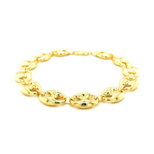 This puffed mariner link bracelet comes in 14k yellow gold and has a width of 11.0 millimeters. Secured with a lobster clasp.