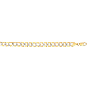 This pave curb bracelet comes in 14k two tone gold and has a width of 12.18 millimeters. Secured with a lobster clasp.