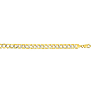 This pave curb bracelet comes in 14k two tone gold and has a width of 8.2 millimeters. Secured with a lobster clasp.