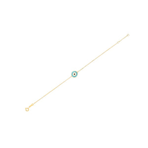 This beautiful 14k yellow gold Blue Evil Eye bracelet comes in a high polish finish & closes with a spring clasp. This piece is hand crafted & sits effortlessly between a glimmering rolo chain. With a touch of protection & a touch of style this piece is sure to stand out. Measuring 7 inches in length.