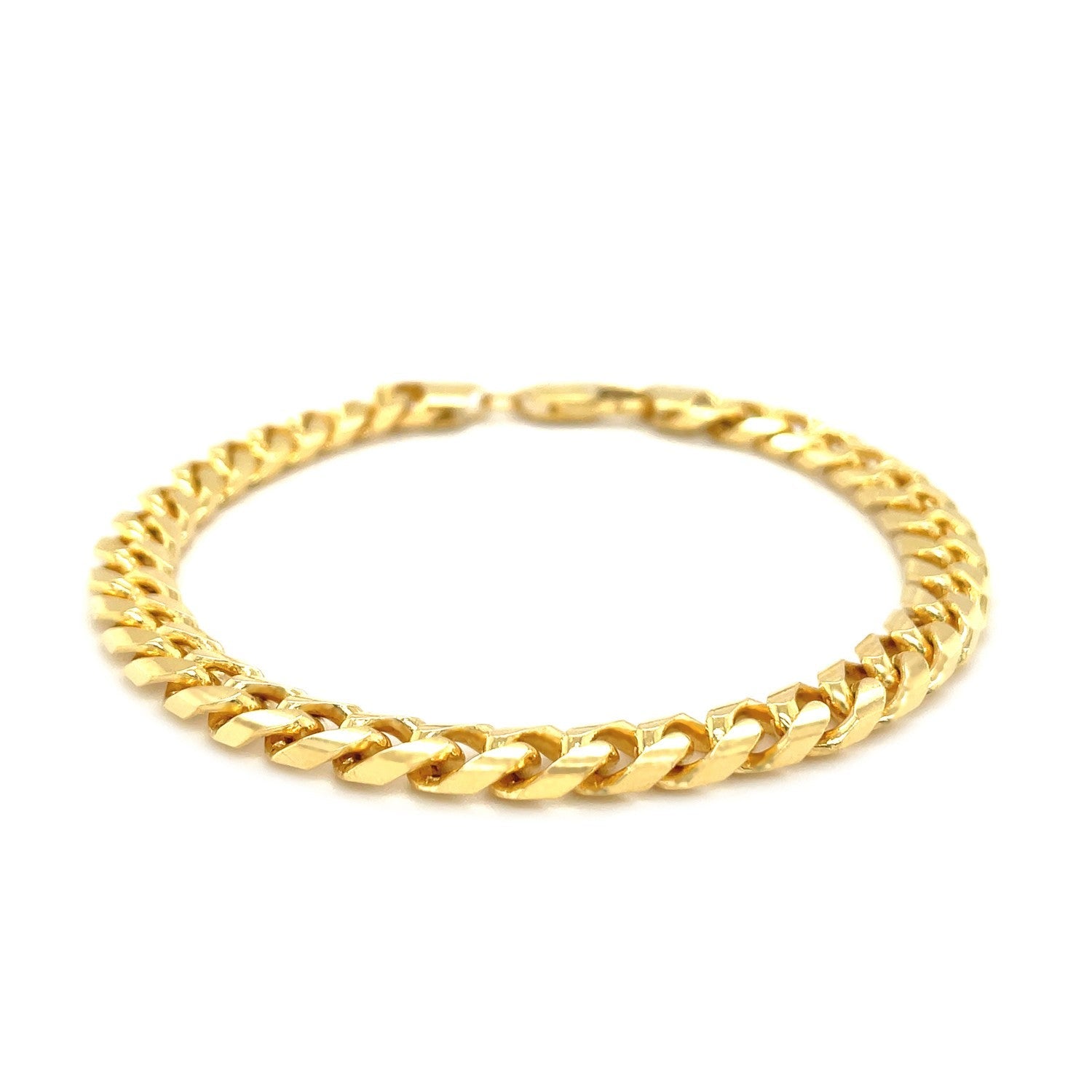 This solid Miami Cuban bracelet comes in 14k yellow gold and has a width of 6.7 millimeters. Secured with a lobster clasp.