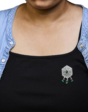 Imbued with the splendor of the Art Deco era, this exquisite 18k white gold brooch pin pendant embodies vintage elegance fused with exceptional craftsmanship. Its shield design, finished with a rhodium plating for enhanced luster and longevity, features a stunning kaleidoscope of natural diamonds, both round and marquise cut, accumulating a lavish 2 3/4 carats. Each diamond, boasting G-H color and VS1-VS2 clarity, radiates with a fiery brilliance. At its heart lies a mesmerizing, oval-shaped natural emerald, its rich verdant hues deepened by a traditional oil treatment, framed by three pear-shaped emeralds that dance whimsically with every movement. Versatility is at the helm of its design, equipped with a jump ring for transformation into a pendant (note, chain not included). This piece is not just jewelry; it's a portal to a bygone era of glamour, perfect for those who cherish both heritage and the art of fine jewelry.