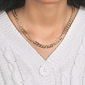 This pave curb chain comes in 14k two tone gold and has a width of 7.0 millimeters.