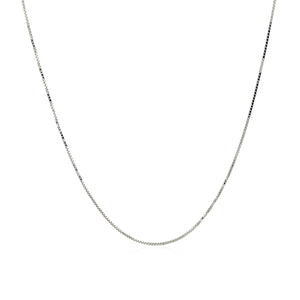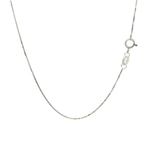 14k white gold, this adjustable box chain measures a width of 0.6 millimeters. The 18 inches can also wear as a 16”, and the 20 inches can also wear as an 18 inches chain secured with a spring ring clasp.
