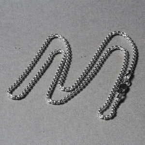 This round box chain comes in 14k white gold and has a width of 1.7 millimeters.