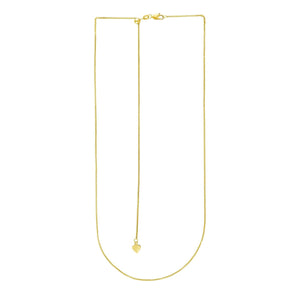 Crafted in 14k yellow gold, this adjustable wheat chain measures a width of 1.0 millimeters and features a heart dangle accent. This chain is available in two sizes adjustable up to 22 inches and 30 inches and is fastened securely with a lobster clasp.