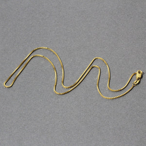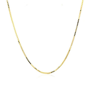 This classic box chain comes in 14k yellow gold and has a width of 0.9 millimeters.