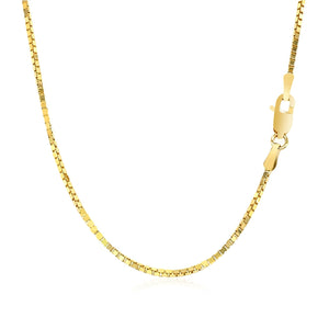 This classic box chain comes in 14k yellow gold and has a width of 1.1 millimeters.