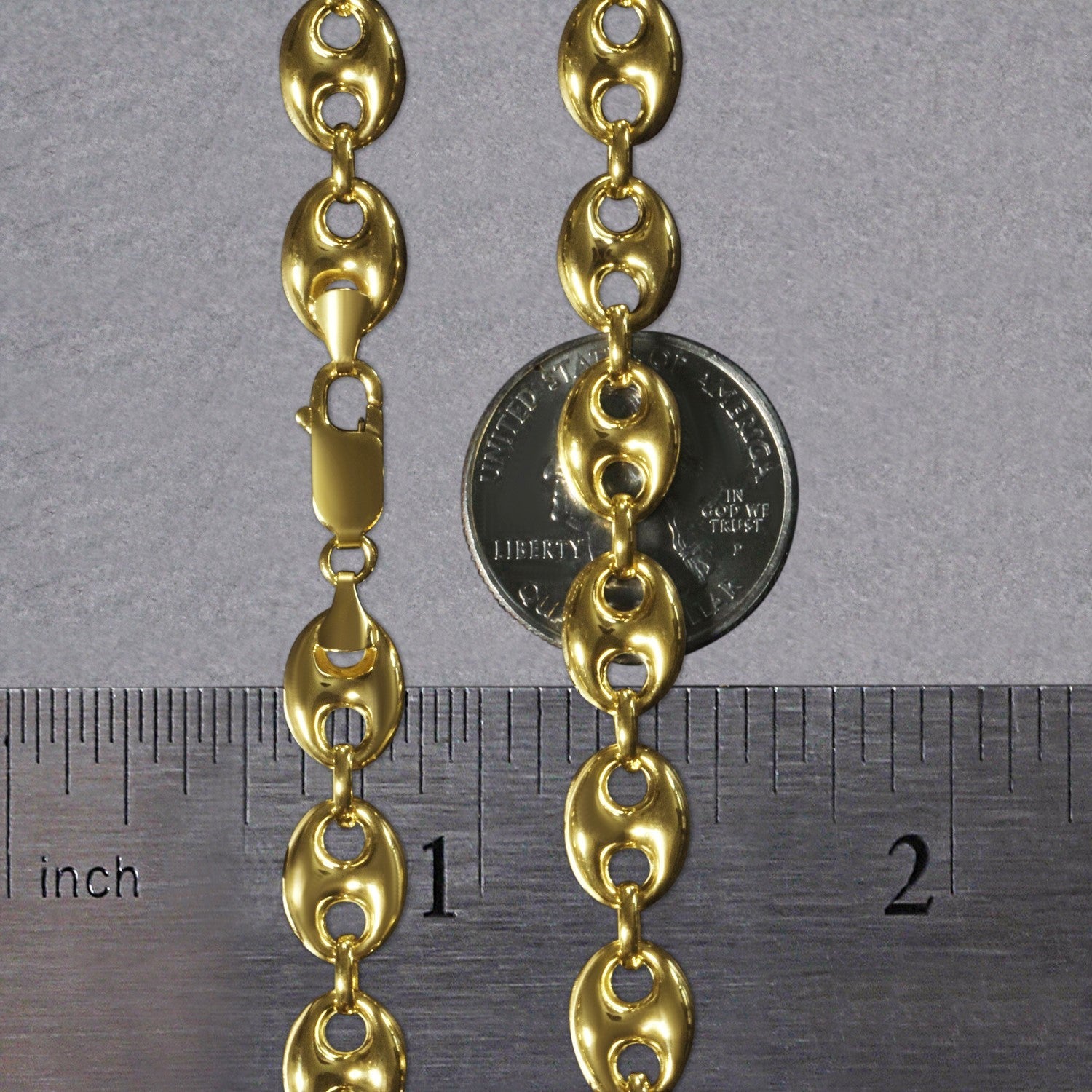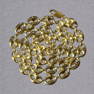 This puffed mariner link chain comes in 14k yellow gold and has a width of 9.0 millimeters.