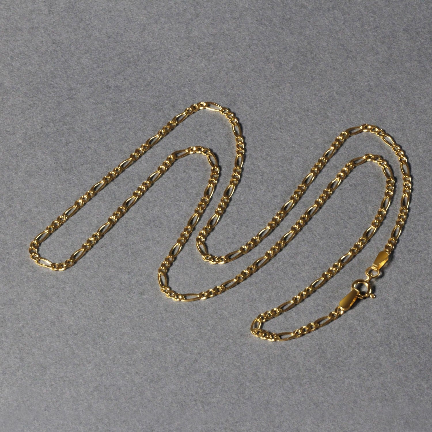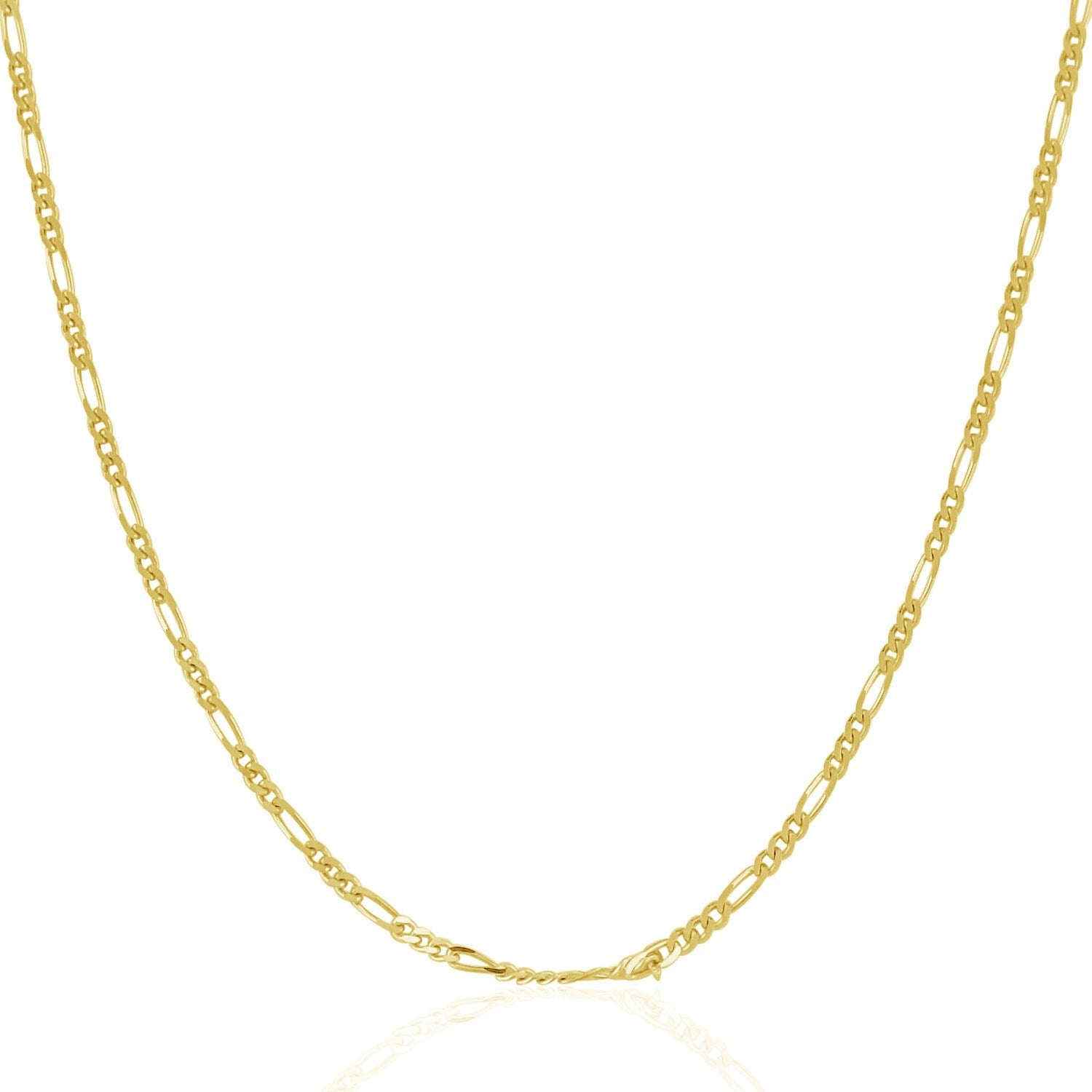 This solid Figaro chain comes in 14k yellow gold and has a width of 1.9 millimeters.