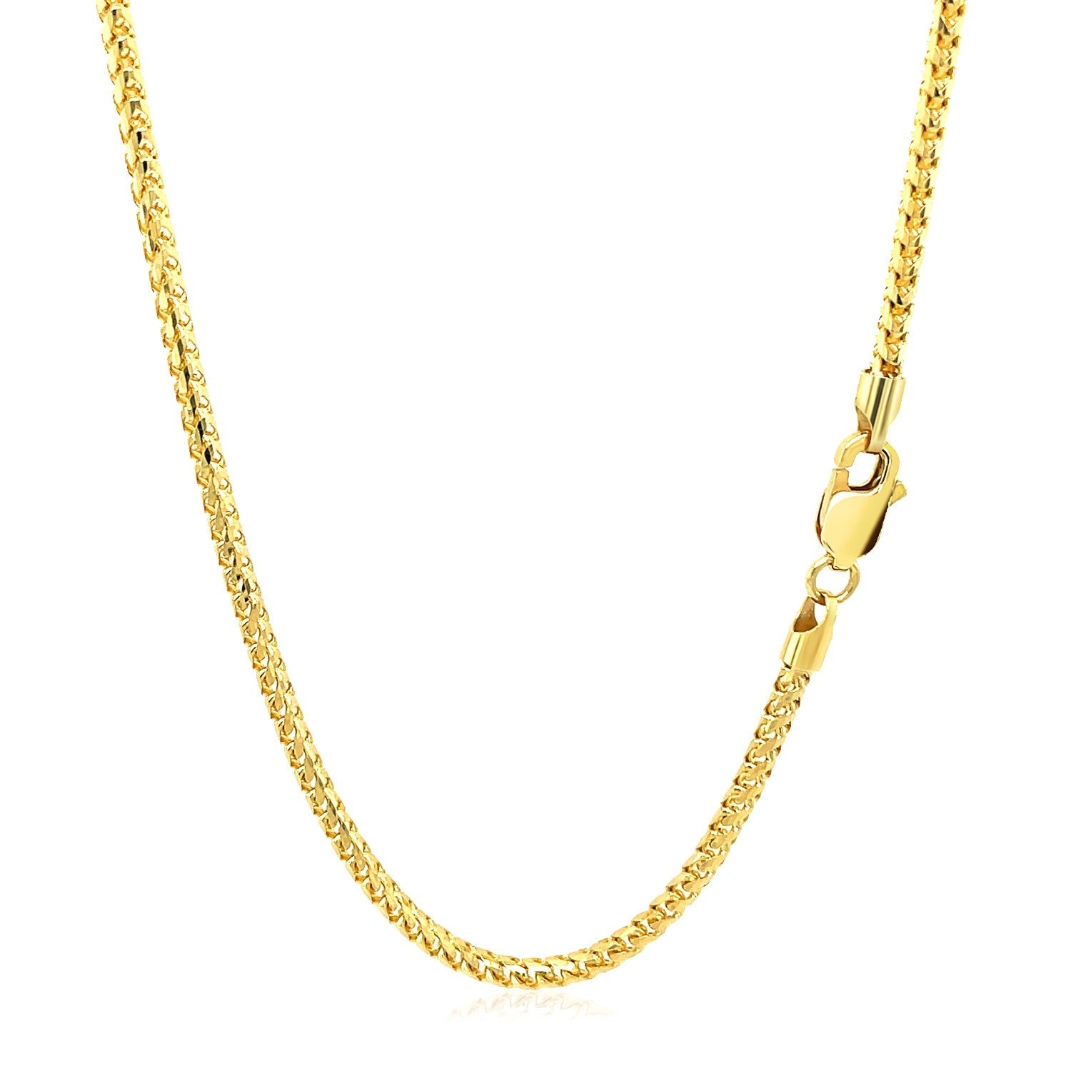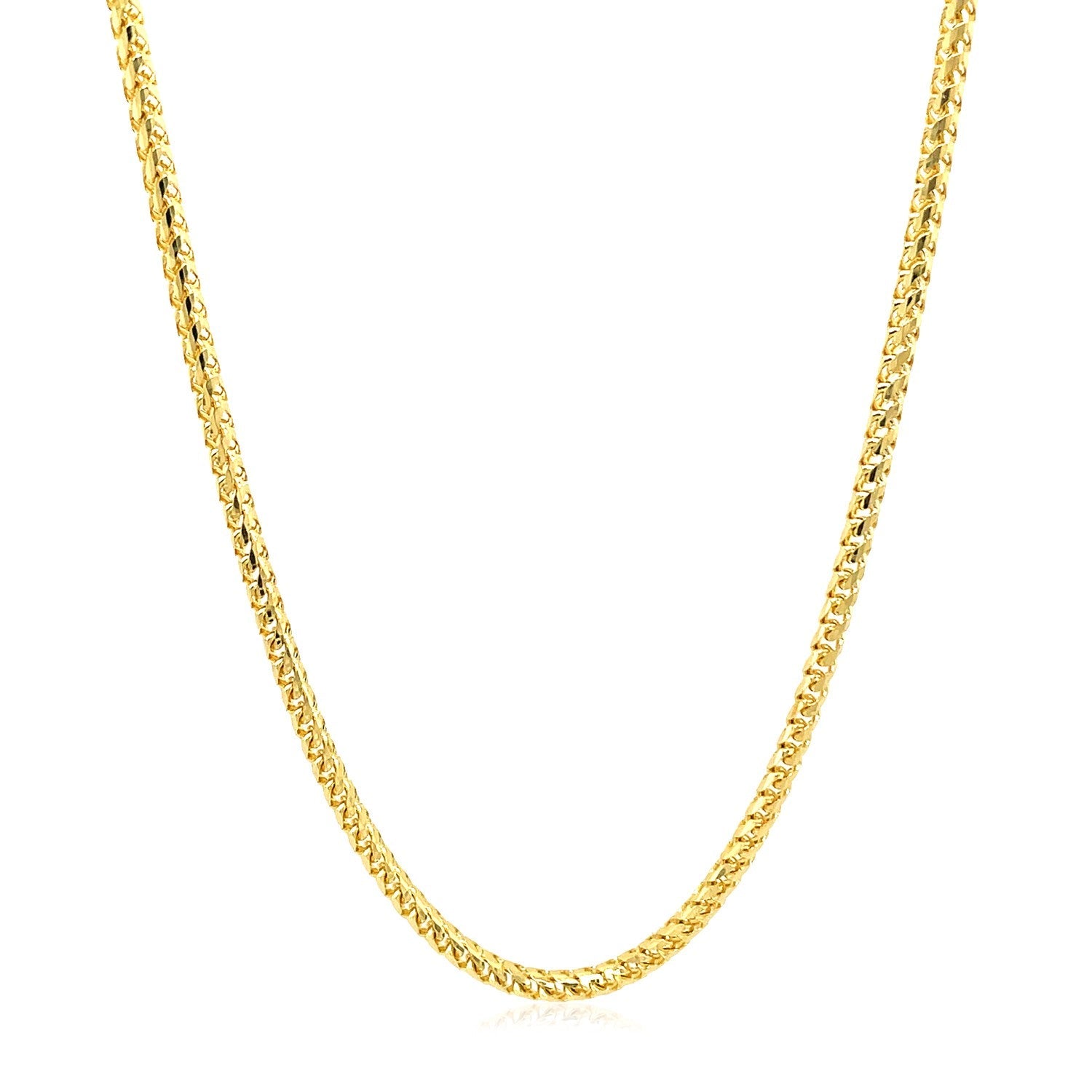 This solid diamond cut round franco chain comes in 14k yellow gold and has a width of 2.2 millimeters.