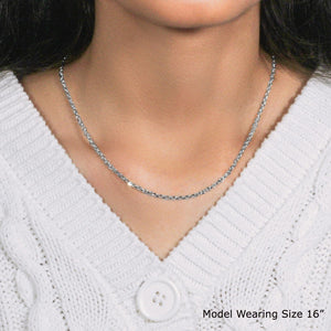 This diamond cut cable link chain comes in 14k white gold and has a width of 2.3 millimeters.