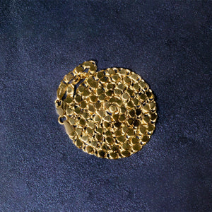 This heart chain comes in 14k yellow gold and has a width of 3.3 millimeters.