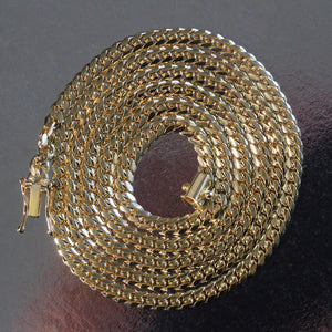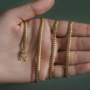 This classic Miami cuban solid chain comes in 10k yellow gold and has a width of 3.9 millimeters.