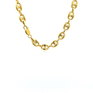 This puffed mariner link chain comes in 14k yellow gold and has a width of 6.9 millimeters.