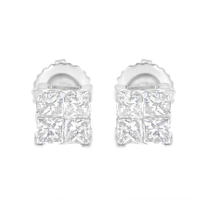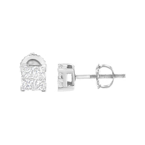 A pair of composite designed quad stud earrings with a cluster of four princess cut diamonds on each stud. These diamonds are invisibly set, creating a larger diamond look. Crafted in 10 karat white gold, they have a total diamond weight of 1/2 carats. These studs come with screwbacks for a secure fit.
