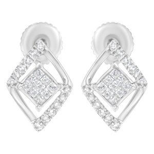 Elegant and timeless, these gorgeous 10 karat white gold stud earrings feature 0. 327 carat total weight of diamonds with 42 individual stones. These earrings have a kite set square shape floating inside a diamond shaped frame. The square is made up of an invisible set cluster of 9 square, princess cut diamonds. This composite diamond floats inside a domed diamond shaped frame studded on opposing diagonal sides with round diamonds. The earrings feature secure threaded screwback closures. These classic earrings make a great gift for any special occasion! diamonds are thought to give the wearer clarity and illuminate solutions to life’s problems, as well as encouraging abundance, strength, courage, harmony, faithfulness, and commitment. These stud style earrings are subtle enough for casual affairs but sparkle in formal settings as well. Coordinate these earrings with your favorite diamond necklace or other diamond jewelry to create a complete elegant ensemble.