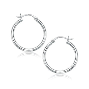 These timeless hoop earrings crafted in 10k white gold and measure 25 millimeters in diameter, featuring a snap lock backing.