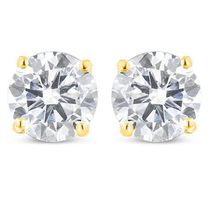 Two gorgeous near-colorless white diamonds sit in a prong setting on these sparkling stud earrings. Crafted in solid 10k gold, these diamond stud earrings feature a high polish finish. These stunning gold earrings feature round brilliant-cut diamonds, and the timeless four-prong settings are sure to keep the gemstones in place. These simple stud style earrings are subtle enough for casual affairs but sparkle in formal settings as well. Coordinate these earrings with your favorite diamond necklace or other diamond jewelry to create a complete elegant ensemble.