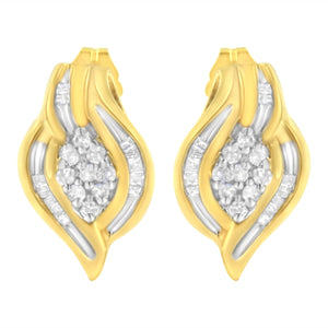Shimmering round cut diamonds come together to create a geometrical shaped center cluster. Warm yellow gold ribbons inlaid with baguette diamonds wrap around the central cluster and create a leaf inspired design. Made in 10k yellow gold, these earrings showcase 1/3ct tdw of diamonds.