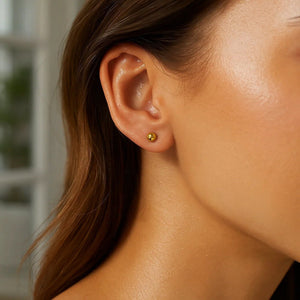 These are darling stud style earrings with shiny globe like motif. Beautifully crafted in 10k yellow gold.