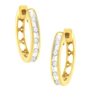 Make a statement with these 1/10 cttw diamond hoop earrings. Crafted in 10k yellow gold plated sterling silver, each of the earrings showcase five sparkling round cut diamonds on a channel setting that line the front of the hoop. A classic design that will become a wardrobe staple.
