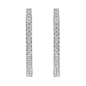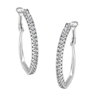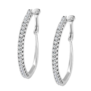 This classic 10k white gold hoop earring feature 1ct tdw of glittering round cut diamonds. The round diamonds are pave set along the front of the hoops for a fine, clean luxury look. A lever back closure keeps the earrings secure.
