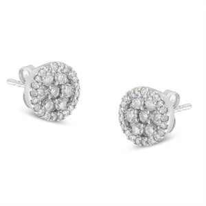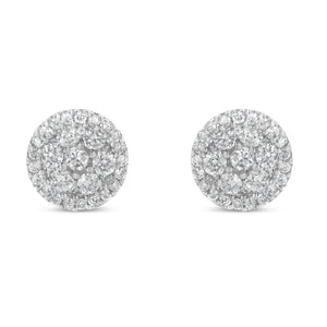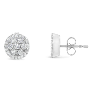 Elegant and timeless, these 14k white gold stud earrings feature round, brilliant cut diamonds in a halo style button shape. The earrings have three circular rows of diamonds with your choice of either ½ or 1. 0 carat total weight worth of diamonds. The earrings feature pushback closures with notched posts and friction backs that keep these pierced earrings safe and secure on your ears for comfortable, worry-free wear all day long. This authentic design is crafted of real 14 karat gold, a precious metal that will keep a tarnish-free shine for years to come. These classic earrings make a great gift for any special occasion! diamonds are thought to give the wearer clarity and illuminate solutions to life’s problems. These stud style floral cluster earrings are subtle enough for casual affairs but sparkle in formal settings as well. Coordinate these earrings with your favorite diamond necklace or other diamond jewelry to create a complete elegant ensemble.