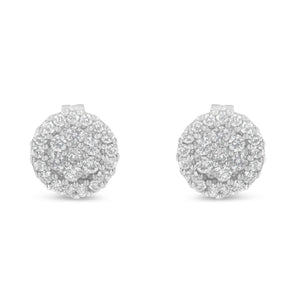 Elegant and timeless, these 14k white gold stud earrings feature round, brilliant cut diamonds in a halo style button shape. The earrings have three circular rows of diamonds with your choice of either ½ or 1. 0 carat total weight worth of diamonds. The earrings feature pushback closures with notched posts and friction backs that keep these pierced earrings safe and secure on your ears for comfortable, worry-free wear all day long. This authentic design is crafted of real 14 karat gold, a precious metal that will keep a tarnish-free shine for years to come. These classic earrings make a great gift for any special occasion! diamonds are thought to give the wearer clarity and illuminate solutions to life’s problems. These stud style floral cluster earrings are subtle enough for casual affairs but sparkle in formal settings as well. Coordinate these earrings with your favorite diamond necklace or other diamond jewelry to create a complete elegant ensemble.