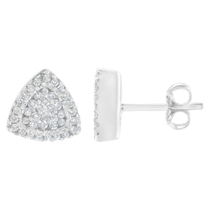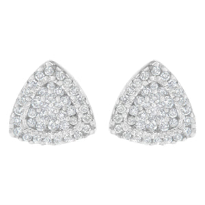 Let yourself be dazzled by these trillion shaped stud earrings. Made in 14k white gold, these earrings showcase 1/2 ct tdw in diamonds. A central diamond cluster is wrapped by a diamond halo. 80 round cut diamonds give this earring design its beautiful shine while a push back mechanism keeps them secure.