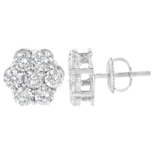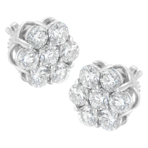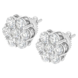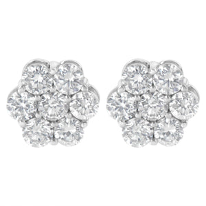 You will fall in love with these classic cluster stud earrings. A must have for any serious jewelry collection, these 14k white gold earrings boast an impressive 2. 0 carat total weight of diamonds with seven stones each. The earrings are floral clusters with seven round, brilliant cut diamonds in shared prong settings. The earrings have stacked open galleries. The stud style earrings have screwback closures. These classic, elegant floral cluster stud earrings make a great gift for any special occasion! whether worn for daytime glamour or evening sparkle, these earrings are gorgeously versatile. Give her a gift that will perfectly complement her favorite ensemble.