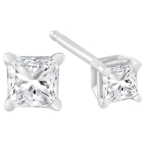 Frame her face with the bold and impressive look of these fabulous princess cut diamond stud earrings. Crafted in 14k white gold, each earring features a mesmerizing princess cut square diamond solitaire in a timeless four-prong setting. Captivating with the brilliance of diamonds and a gleaming buffed luster, these anytime post earrings fasten securely and comfortably. This stud is the perfect item to wear on any outfit and is considered an investment piece.