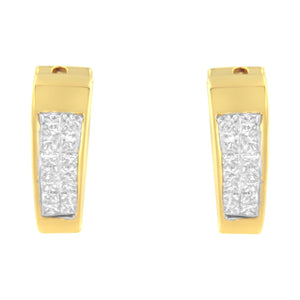 These petite and trendy diamond huggy earrings are the perfect gift for any loved one. Created in 14k yellow gold, this beautiful piece has heart-shaped designs etched into it's base. With a total diamond weight of 1/2 ct. , these hoops showcase stunning princess-cut diamonds in an invisible setting.