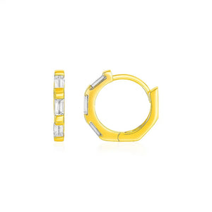 The sparkle of rectangular cubic zirconias combines with the high polish of 14k yellow gold in these bright and luminous octagonal hoop earrings. Earrings are 11mm long and are held in place by snap clasps.