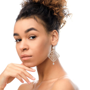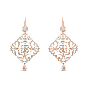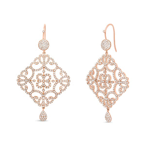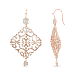 A feminine energy ignites the look of these gorgeous dangle drop earrings crafted from genuine 18k rose gold. An incredible sparkle emanates from the 620 round white diamonds that glisten from their prong settings. These glittering stones total 3 1/4 cttw with an approximate H-I Color and SI1-SI2 Clarity. The metalwork features an upper dangle in a circular silhouette, proceeded by an intricate openwork filigree motif, and finished with a teardrop-shaped lower dangle, all encrusted with the prestige of diamonds. This glamorous pair secures in the ears via hook findings.