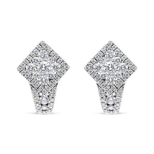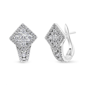 Increase her sparkle factor with these shimmering diamond huggie earrings. Crafted from cool 18K white gold, each huggie hoop earring features a rhombus shape of tightly packed round diamonds surrounded by a halo of round diamonds to give a rectangular diamond halo frame. Below, a 3-row channel of round diamonds run down into the latch back mechanism. Uniquely timeless with 1 1/10 ct. t.w. of diamonds and a bright polished shine, these earrings secure with a latch back.
