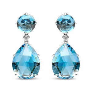 These attractive dangle earrings cultivate a sophisticated style in genuine 18k white gold with natural gemstones and diamonds in a linear design. The upper dangle shows off with a gleaming round color-treated London blue topaz gemstone in a prong setting. Directly blow sits a prong-set round white diamond. The sway of these drop earrings focuses around 20 x 15mm pear-cut heat-treated sky blue topaz gemstones in prong settings. The diamonds in this pair total 1/5 cttw with an approximate G-H Color and SI1-SI2 Clarity. These pierced earrings are easy to put on and take off with secure push back findings.