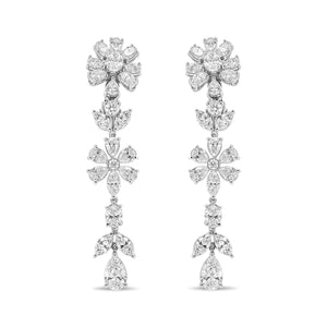 A perfect complement to any look, this richly presented pair of diamond flower earrings is a fresh and stylish approach to accessorizing. This intricate flower motif bestows elegance and sophistication to its wearer, exemplifying excellence in with a striking 2.4 inch dangle length. Within the upper drop is a flower design abloom with gorgeous pear-shaped diamonds in 3-prong settings and oval diamonds in 4-prong settings. The eye is drawn next to a round diamond in a 3-prong setting with marquise diamonds acting as delicate leaves on display from their 2-prong settings. Another flower motif stands central with a stunning round diamond at its core set securely within a bezel setting and surrounded by sparkling diamond "petals." Additional dazzling white diamonds cascade in nature-inspired theme fresh from the garden. The 48 diamonds total 10.26 cttw and are of an approximate VS1-VS2 Clarity and G-H Color. The 18k white gold presents a polished appeal and these earrings secure with omega findings.
