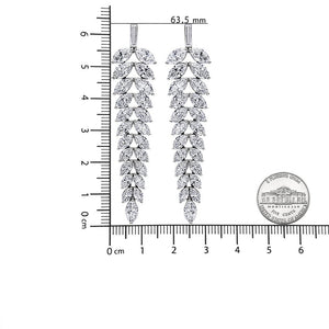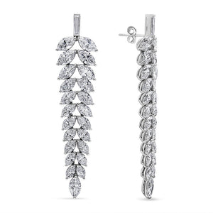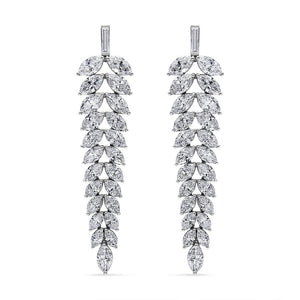 These opulent 16.00 ct. t.w. diamond cluster chandelier earrings are beyond breathtaking! The earrings start with a bale, channel set with a slender baguette diamond. From there the earrings fan out with a symmetrical chandelier with 22 marquise shaped diamonds per piece. Finally. the earrings conclude with a stunning, single marquise drop. A gorgeous heirloom-quality pair with enduring appeal. Finely crafted in polished 18kt white gold. These magnificent earrings are truly one of a kind, and a must have for your jewelry collection. Hanging length is 2 1/2" inches. The earrings have an omega back for a secure, yet comfortable fit. Diamonds are approximately rated F-G in color, and VS2-SI1 in clarity for stunning shine.