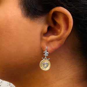 Step into a world of enchantment with our 18K Yellow Gold Plated .925 Sterling Silver Diamond Drop Earrings. Crafted with precision and elegance, these earrings feature 32 natural round diamonds with a total weight of 1/8 carats, showcasing a captivating I-J color and sparkling clarity of SI1-SI2. The diamonds are delicately set in shared prongs, enhancing their brilliance and ensuring lasting durability. The hammered finished medallion heart design adds a touch of artisanal charm, making these earrings a perfect choice for those who appreciate fine craftsmanship and timeless beauty. With lever-back clasps for a secure fit, these earrings are not only stylish but also practical for everyday wear. Elevate your look with these exquisite earrings that effortlessly combine sophistication and glamour.
